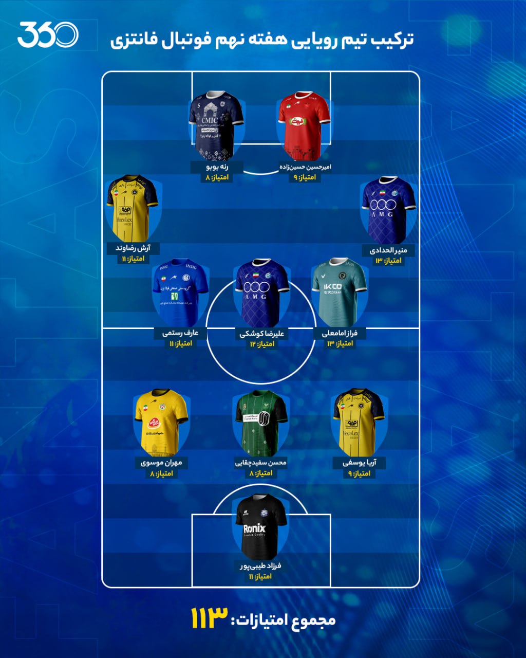 به گزارش فوتبال 360، ستارگان این هفته فوتبال فانتزی، بین تیمهای مختلف پخش بودند و 9 تیم در تیم رویایی هفته نماینده داشت و تنها از استقلال و سپاهان 2 بازیکن در ترکیب این تیم به چشم خورد. تیم رویایی این هفته با 113 امتیاز شکل گرفت.