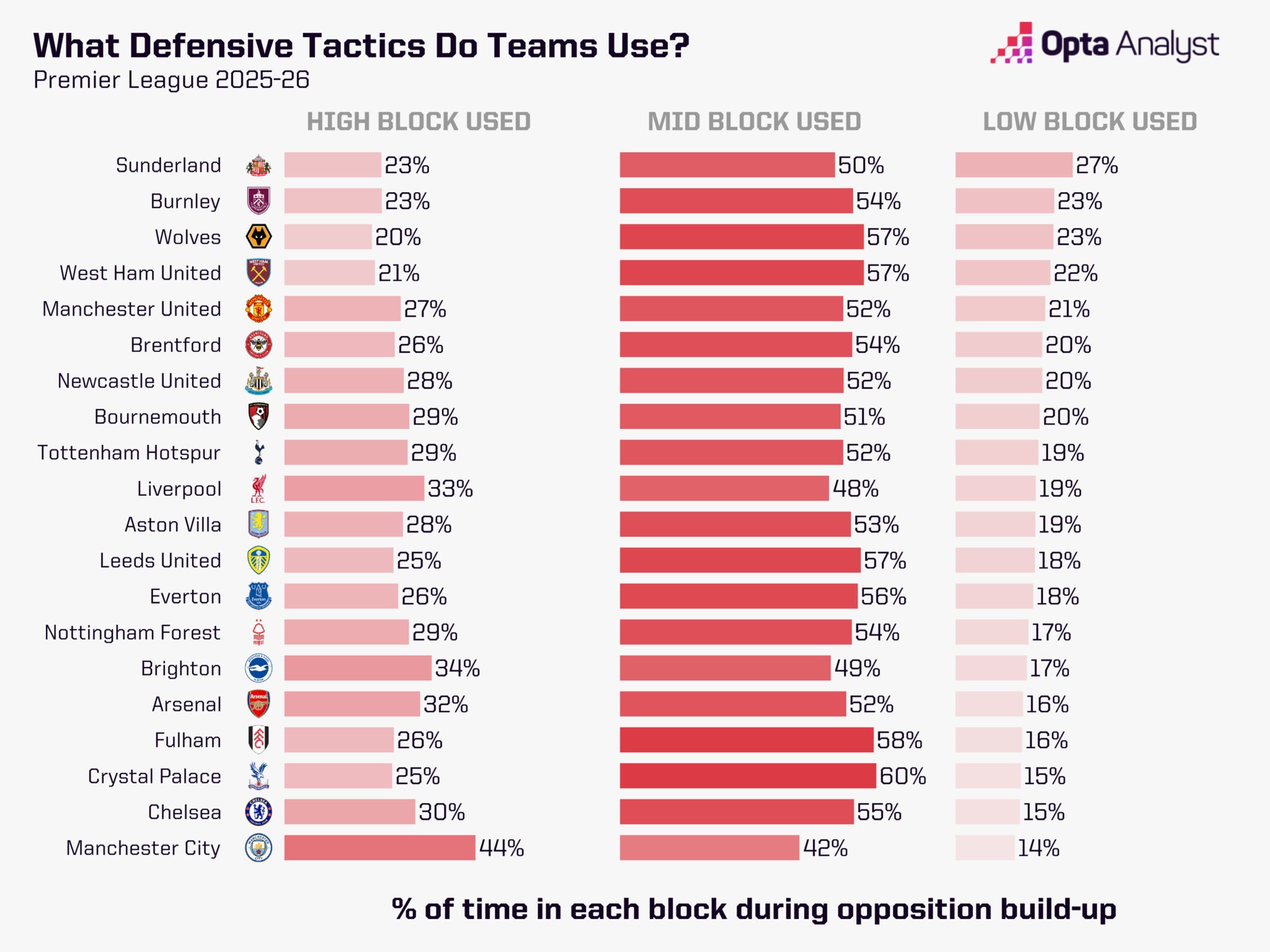 این عدد در فصل جاری دقیقاً مشابه است اما به دلیل فشردهتر شدن ساختار تیم منچستریونایتد، کمتر به چشم آمده. برای مثال، منچستریونایتد در فصل جاری تنها 27 درصد زمان بازیها را با ایجاد بلوک دفاعی بالا سپری کرده. این رقم در فصل گذشته 32 درصد و در فصل پیشین 30 درصد بود. با این حال، میانگین فاصله آغاز توالی پاسهای آنها از دروازه خودی به 42.8 متر رسیده و نسبت به 42.3 متر فصل گذشته و 41.5 متر فصل پیش از آن، افزایش یافته.