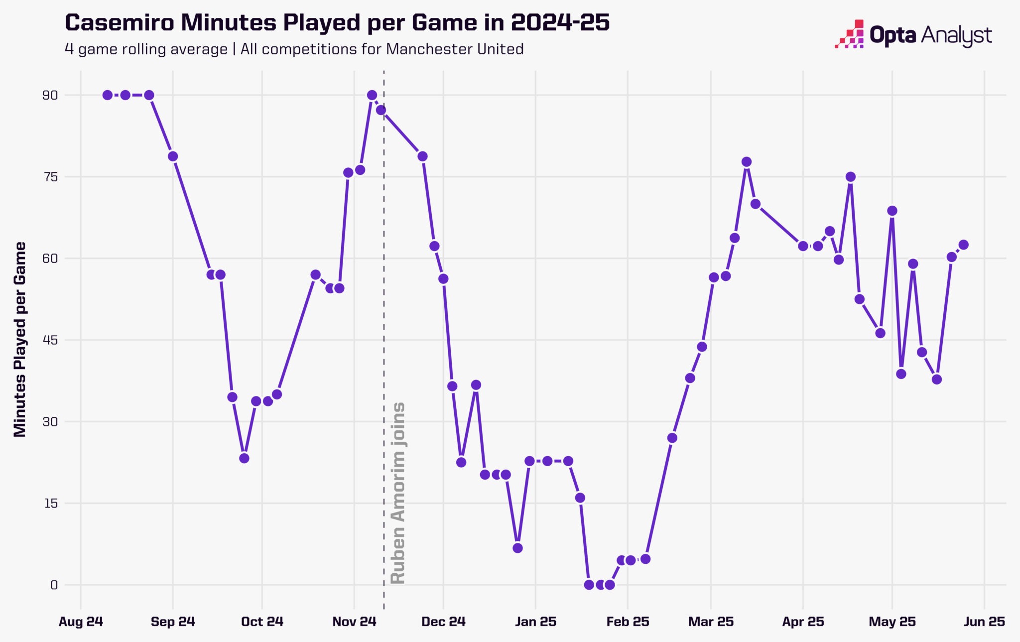 نمودار فصل گذشته نشان میدهد دقایق بازی کاسمیرو درست پس از ورود آموریم بهشدت کاهش یافت اما همزمان، نشاندهنده تلاش موفق او برای بازگشت به ترکیب اصلی است. یکی از مشکلات اصلی کاسمیرو پیش از ورود آموریم، باز بودن بیش از حد ساختار ترکیب تیم منچستریونایتد بود.